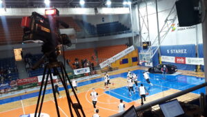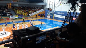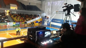 Basket Brno, zápas EuroCup – mezinárodní přímý přenos na 5 kamer pro FIBA Europe TV, efektové osvětlení zápasů. Do přenosu nyní nově zařazujeme pojízdnou radiokameru na kolečkách.
