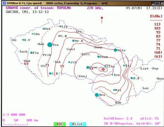 Dosah vysílačů 1500 kW (nahoře), 750 kW a 50 kW (dole).